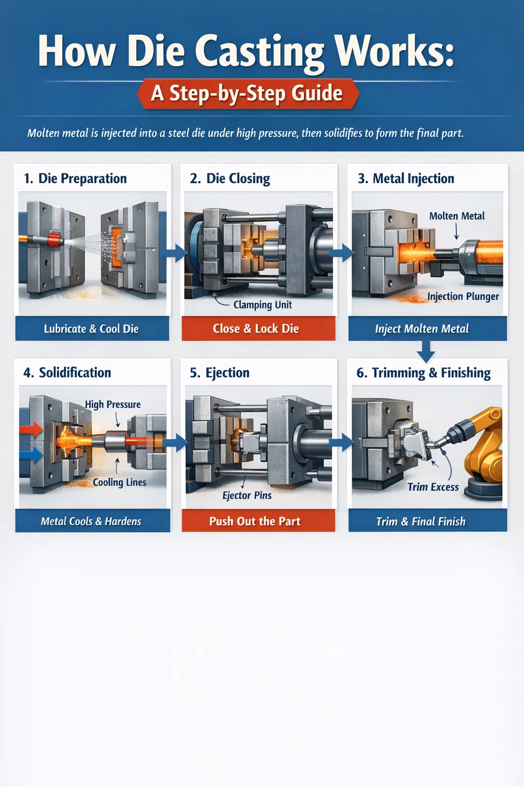 다이캐스팅이 어떻게 이루어지는지 이해하려면 생산 주기의 각 단계를 거쳐야 합니다. 기계와 합금에 따라 변형이 발생하지만 기본 순서는 업계 전반에 걸쳐 일관됩니다.