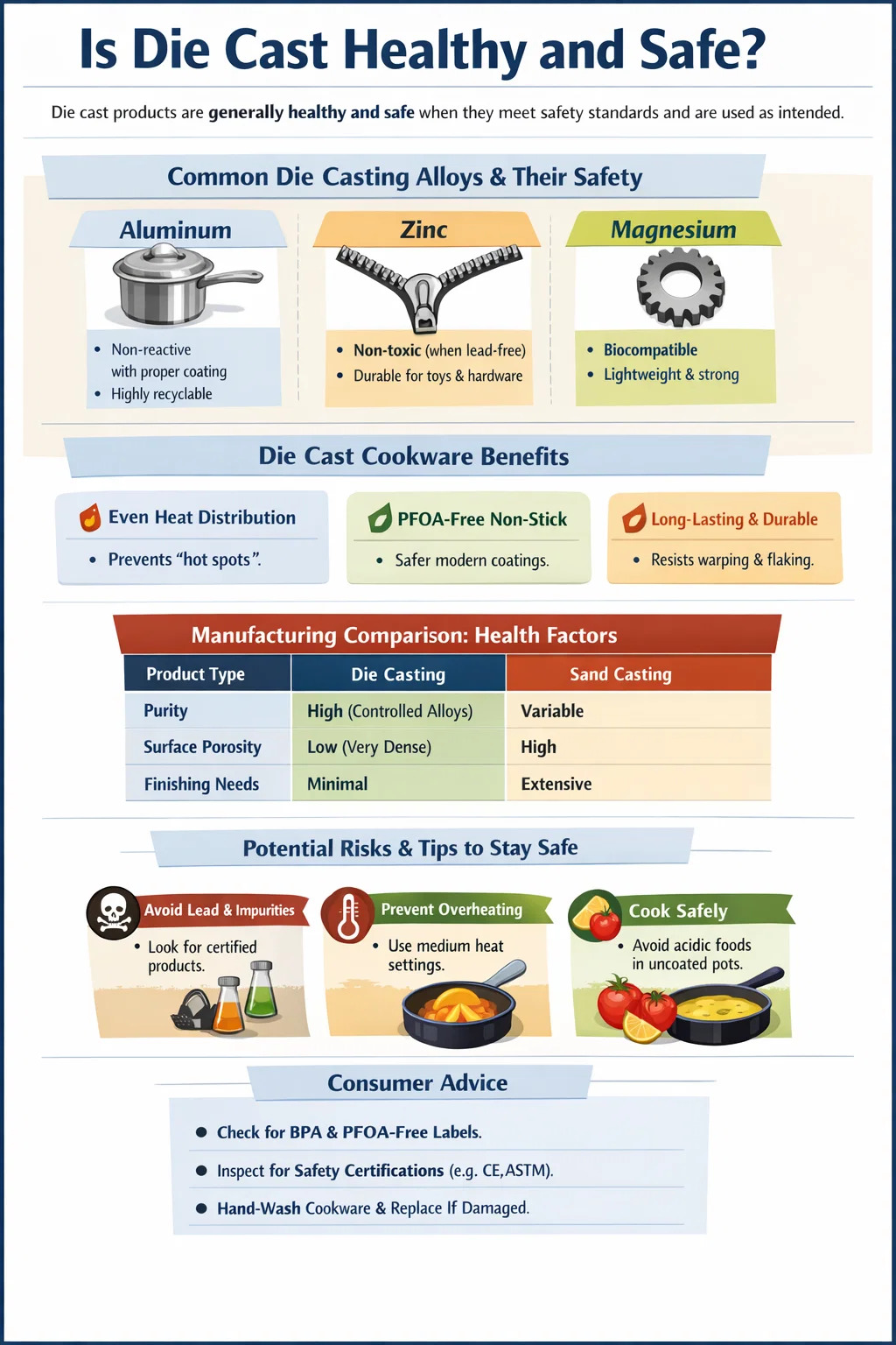 일반적으로, 다음을 통해 만들어진 제품은 다이캐스팅 국제 안전 표준을 충족하고 의도한 대로 사용된다면 일상적인 사용에 건강하고 안전한 것으로 간주됩니다. 다이캐스트 품목의 "건강성"은 주로 사용된 비금속(알루미늄, 아연, 마그네슘 등)과 이에 적용되는 표면 처리에 따라 달라집니다. 조리기구의 경우, 다이캐스트 알루미늄은 적절하게 코팅되었을 때 반응성이 없기 때문에 매우 인기가 높습니다. 반면, 장난감 및 하드웨어의 경우 다이캐스트 아연은 내구성이 있고 납과 같은 독성 첨가물이 없기 때문에 선호됩니다.