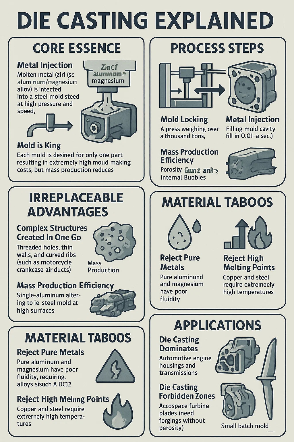금속 분사 성형 : 용융 금속 (아연/알루미늄/마그네슘 합금)을 고압 및 속도로 강철 곰팡이에 주입하고 냉각 후 배출하여 부품을 형성합니다.