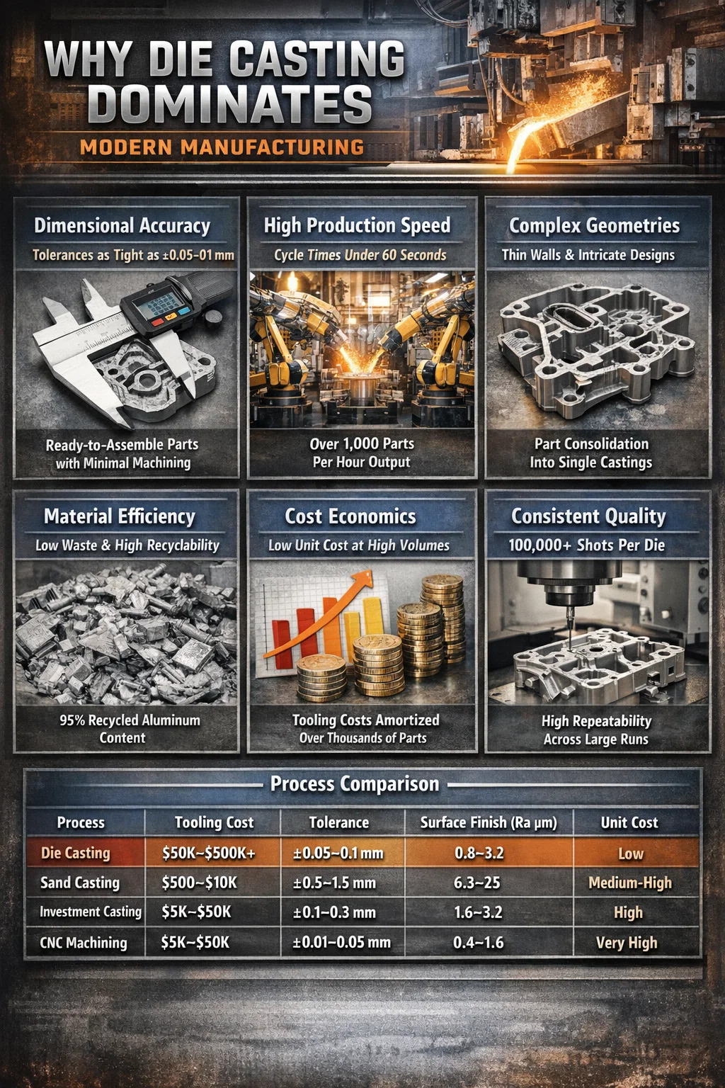 이 기사에서는 치수 정확도, 속도, 재료 효율성, 비용 경제성 및 경쟁 공정과의 비교를 다루면서 다이캐스팅이 현대 제조 분야에서 지배적인 위치를 차지하는 이유를 정확하게 분석합니다.